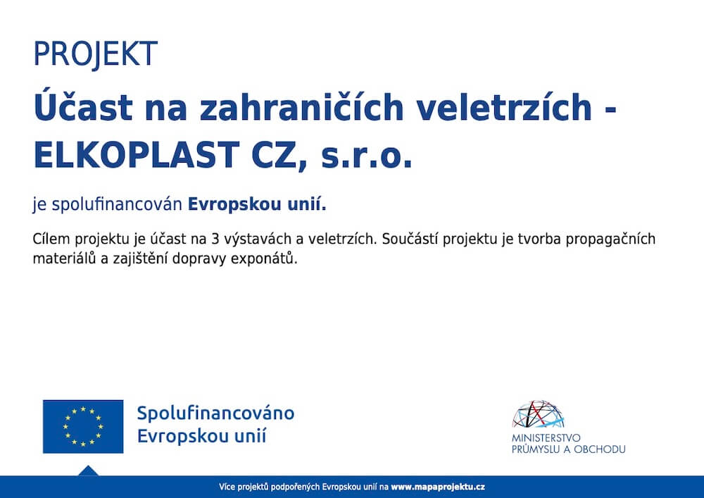 Předmětem projektu je podpora exportních aktivit společnosti ELKOPLAST CZ, s.r.o. Společnost ELKOPLAST CZ, s.r.o. bude v rámci projektu prezentovat své produkty na 3 prestižních veletrzích věnovaných enviromentální problematice (2x IFAT, 1x Pollutec).